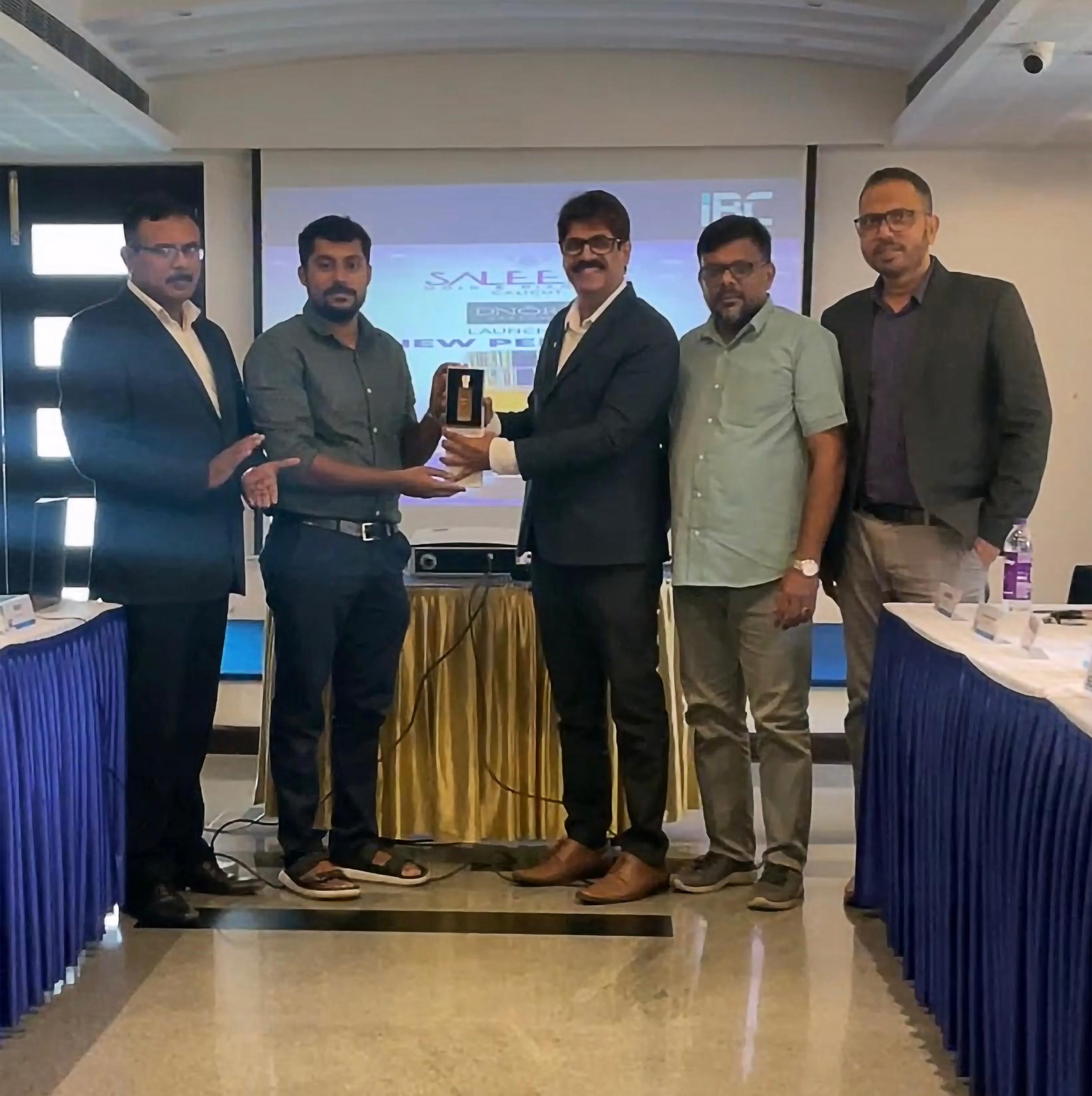 Advocate Jaleel Onath,Director IBC,unveiled DNORA's latest fragrance, "GOLDEN OUD," by presenting it to Architect Rishad of Arclan Architects at the I